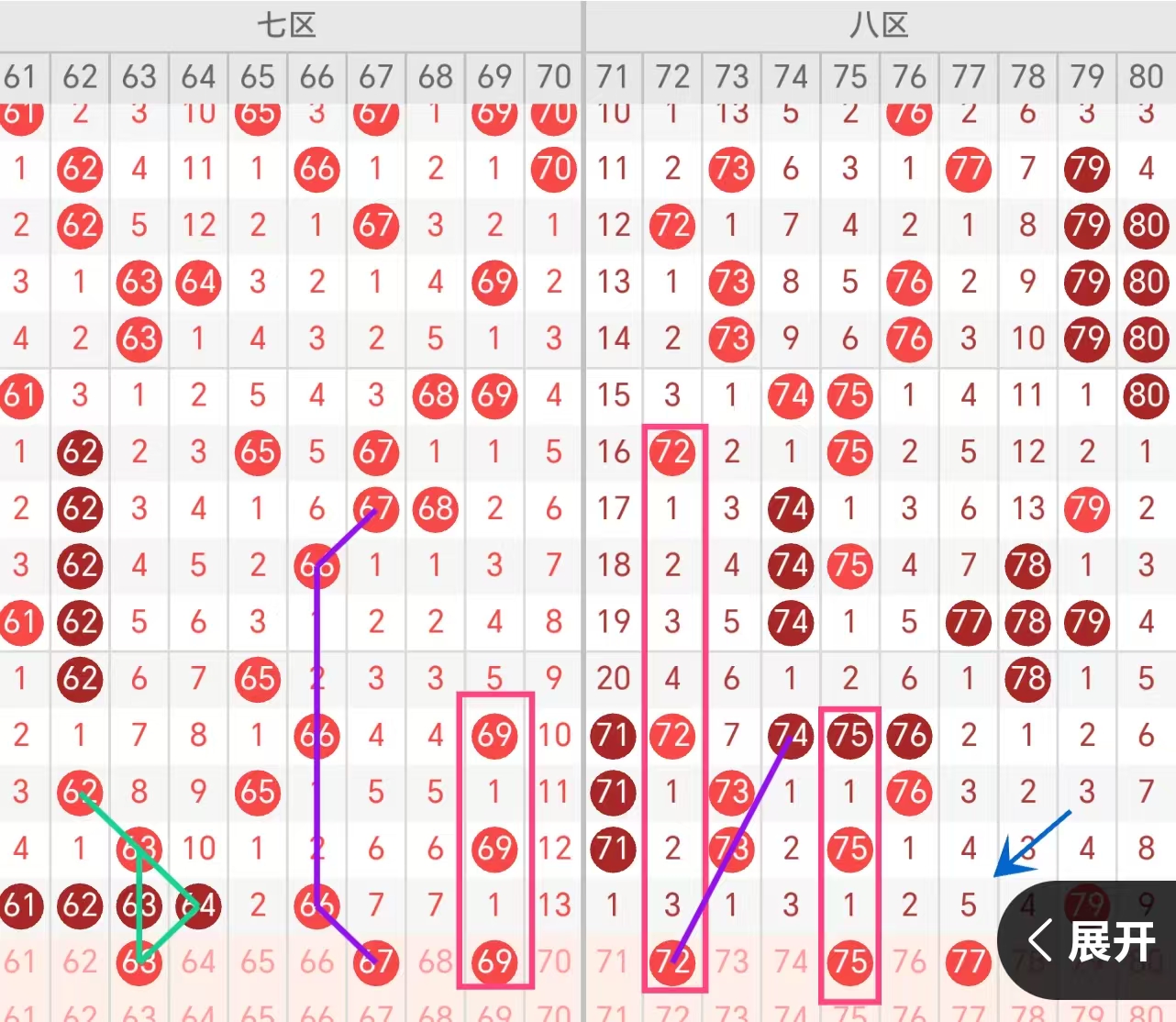 七区(61-70):近期大遗漏回补,连号走势明显,近期重号号码需要重点考虑,所以本期作者主要看重号,63看三重,66-67形态对称,看过上期作者的文章分享,上期类似 66-67的形态对称走势上期都下了!69空一空一遗漏对称走势!