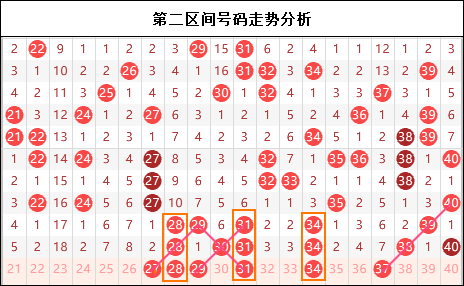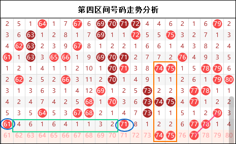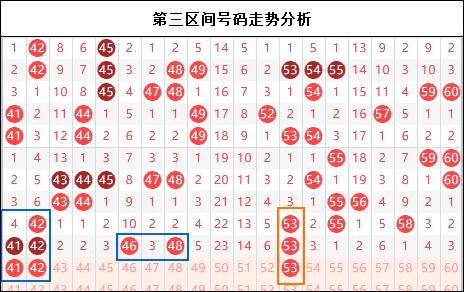 第三区间思路:三区主打后半部分,没想到出现在前半部分中,好在与二区的衔接中我们想到了这一点。从布局思路来看,后半部分的隔期思路在本期恐怕将会落空,而本期最大的亮点显然是中部越走越冷的号码,这里理论上要切进去布局的时候来了。但是主线显然还是重号思路这一点不会变化。