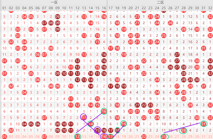 二区看好3尾9尾,边号17 18 19 27 29出一码,重号断2期,如果回补就是17 18 28 三出一,如有看重号优先看17,隔一期号出3期,本期19 21 31是隔一期号,看19,隔4期号出2期,本期只有29是隔4期号,形态上17 25是斜连号,上图已勾画,同尾号出三期,本期防19 29或者22 32同尾号,守一期23,结论关注五码17 19 22 23 32防25