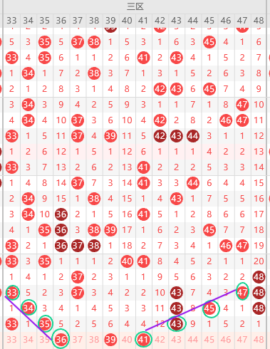 三区胆尾1尾,边号34 36 42 44 出一码,重号33 35 43出一码,形态上36 61是斜连号,上图已勾画,缩小范围隔一期号34 45 48大概率三出一,8尾热优先看48,3尾出三期防33,结论关注五码33 34 35 36 44