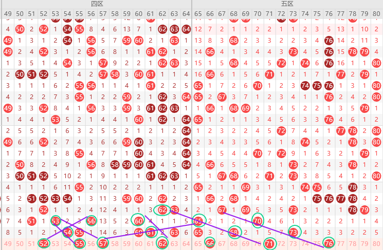 四区胆尾2尾4尾,边号53 55 56 59 62 64出一码,重号54 55 60 61 63出一码,形态上52 55 57 62是斜连号上图已勾画,缩小范围5开头稳定出边号,那么本期53 54 55 56要出一码,6开头大概率1-2码62 64二出一,0尾热防50,结论关注五码50 52 53 54 62