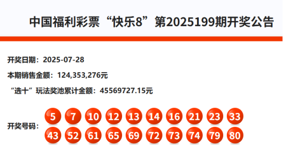 首先我们来回顾快乐8第2025199期开奖号码: