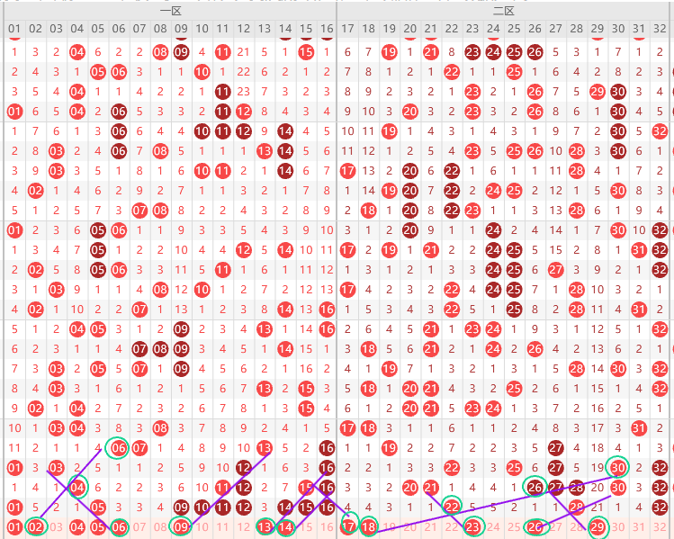 二区胆尾2尾0尾,边号21 23 27 29 31出一码,缩小范围边号都出在2开头,那就是21 23 27 29出1-2码,7尾最热先看27,重号三出一22 28 32出一码, 形态上17 18 23 26 29是斜连号,上图已勾画,2尾连出3期本期大概率22 32要出一码,防32出四直落,算周期1开头要出号本期防守一期17,结论关注五码 22 24 27 30 32防17
