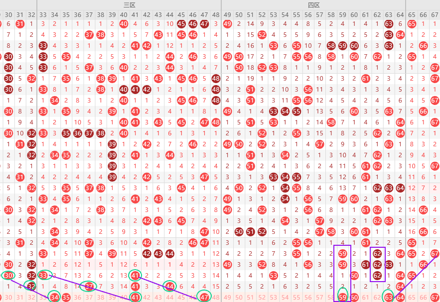 三区胆尾1尾7尾,边号断三期了,本期大概率有边号36 38 40 42 43 45要出1-2码,重号37 41 44出一码,形态上34 41 47是斜连号,上图已勾画,近二期3开头只出一码,4开头是走热趋势,那么4开头边号要更多关注,结论关注五码34 37 41 45 47