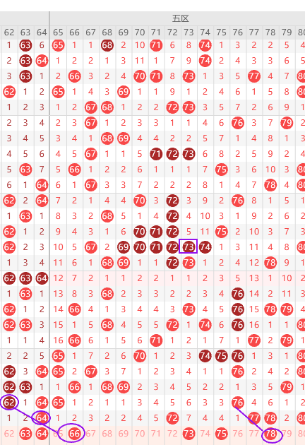 五区看好2尾3尾6尾,边号71 73 76 77 78 79出一码,重号72 77 78 80出一码,6尾出8期上期中断,本期防回补66 76出一,最近6开头不怎么出号,6开头只需要防守一码66,7开头稳定出边号也就是本期71 73 76 79要出一码,形态上78 66是斜连号,上图已勾画,五区9尾到出号周期,最近2期要出也就是69 79要防守2期,出结论关注五码66 72 73 76 79
