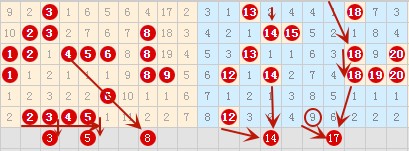 在上期1-10号数字中开出了4连号2 3 4 5这4个数字,那么本期应该是要落1-2个号的,暂时看好落号3和5号数字,8 9号这两个连号已经有两期没有落号了,这期应该是要落一个号的,我比较看好8号数字。11-20号区间的号不好选,分析前30期12与14号数字前后出现的次数还是比较多的,还是比较看好14号数字的。17号数字属于冷号的邻居,所以也是比较看好的。本来18 19 20号这个三连号有可能要落号的,但是前面连号空2期落号的已经选了,这里就不做推荐了。