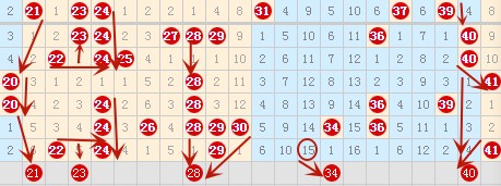 在上图中21号数字属于有2种对称类型,所以还是比较看好的,23号数字属于22 24号数字夹号,在前几期中出过,那么这期会不会被夹出来呢。上期在28 29 30这个三连号落了一个还,上期分析没有错,这期应该还是要落一个号,我比较看好28号数字,它也属于3重对称型的,所以比较看好。34号数字属于特冷号的邻号,且上上期已经露头,那么这期会不会空一跳呢?还是希望很大的。40号也属于2重对称类型,也是比较看好的。