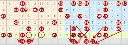 在上图中44号数字数3对2重号对称,还是有希望出好的,45 47号数字在上期没有落号,那么这期不然是要落一个号的,我比较看好45号数字。51-60这个区间一直都是热闹区,52号数字是3重号、3斜连号,所以本期比较看好,54 55号在上上期出过类似形态的号码,所以本期不得不防。55与58这两个号码今天是要落一个的,本人比较看好55号数字,58号数字有待商确。