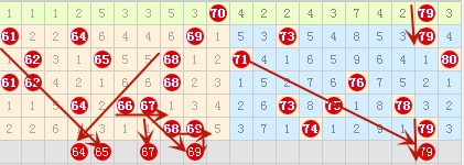 在上图中64号数字属于空1斜5连,估计今天不会断连吧。65号数字也是属于空2斜4连,也比较看好,不知道64 65这两个数字出哪一个或者两个都出,都选上吧。66 67与68 69这2对2连号是要落号的,我比较看好67 69号数字。79号数字在上期空2斜连出来了,本期的空3斜连会不会出来呢,还是有很大概率的。