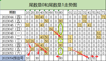 尾数0上期精准命中号码50重号走势的落下,来看看本期这个尾数的号码走势,首先可以看到在050期号码10空档1期斜开052期号码20回补落在本期号码10上面走出的三角走势很乐观,同样在050期号码20隔期斜开30,40,落在上期号码50上的斜开四连号走势下,号码20,40,50分别开出过,且号码40,50是隔期重号落下的,这里我们可以看到四连号走势下的遗漏号码30在本期落下的优势很大。而在045期号码80空档3期落在049期上之后是空档1期落在051期上,本期这个号码80空档2期状态落下走出空期走势很有可能,而在047期号码60隔期斜开70,80走出的三连号走势下,只有号码80开出过,再来看前面050期号码20开始的斜开四连号走势落在本期号码60上面会走出斜开五连号走势,结合047期号码60开始的三连号走势下,本期号码60连号70落下也是有机会的。不过在近期尾数0的活跃状态下,也有可能走出空期遗漏1期没有落下号码的走势,但是这个尾数继续活跃的优势更大,怎么说呢?乘胜追击嘛,所以这个尾数保守选号是2个号码左右,本期看好:10,30,60,70,80。