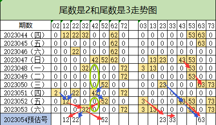 尾数3在051期空期遗漏1期没有开出号码后,连续2期开出4个号码,而上期的开出3个重号03,53,73,号码13和43分别跟随这3个重号落下,那么首先可以考虑尾数3所有号码遗漏的23,33,63。在052期号码03斜开上期号码13继续这个走势落在本期号码23上面会走出斜开三连号走势,而近10期尾数3遗漏最大号码可适当考虑连号23落下的可能,在052期号码43斜开上期号码53落在本期号码63上面会走出斜开三连号走势,同样在050期号码23空档1期斜开落在052期号码43上面继续落在本期号码63上面会走出空期斜开三连号走势。在046期空期遗漏1期没有落下号码下,隔期在047期开出4个号码,在048期开出3个号码,重号开出047期两个号码,分析到这里,根据上期开出4个号号码走势下,本期可以大胆预测尾数3可能空期遗漏1期,或者开出3个左右号码落在本期上,本期看好23,33,63。