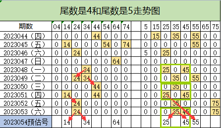 尾数4上期开出1个号码且还是重号24,近10期尾数4开出的号码不多,但是重号走势下的斜开二连号走势几乎没有间断过,近期051期号码14隔期斜开24走出二连号走势,上期重号24落下后,两边斜开14,34的二连号走势就基本是稳定的,在048期号码34隔期重号开出34连号24落下后,这里就走出了一个往前斜开二连号走势,然后049期重号34隔期斜开号码44走出往后斜开二连号走势,以这个走势为基础可以优先考虑本期斜开二连号往后开出二连号走势,而尾数4的最大遗漏号码04在上期尾数3号码03重号开出后,本期同样头数是0的号码04邻号落在本期的可能性蛮大的,而号码64在空期走势倍数3的状态下落在本期也是有机会的,本期看好14,34,64。