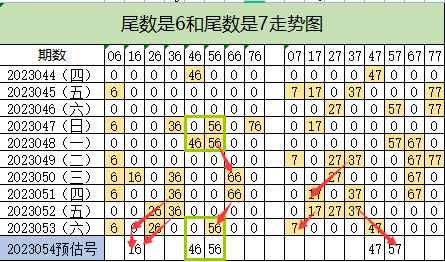 尾数6上期开出3个号码,在051期号码36隔期斜开26落在上期号码16上面的斜开三连号走势落空,而在052期重号36斜开上期重号26落在本期号码16上面同样可以走出斜开三连号走势,所以可以优先考虑号码16的开出,而在047期号码56隔期重号连号46落在048期上走出的L形走势下,048期号码56空档1期斜开050期号码66二连号,在051期号码66重号开出后,这个号码66空档1期斜开上期号码56的二连号走势下,本期号码56重号开出连号46走出L形走势很基本稳定又有优势的,这里保守起见还可以选择号码46的邻号36的落下,因为如果本期尾数6的号码走势都落空了,那么很有可能会落在号码36上面走出近10期的递减空期走势。本期看好号码16,36,46,56