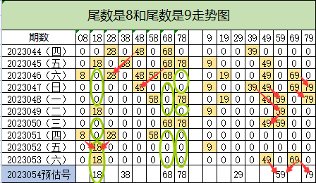 尾数8首先可以看到在045期号码18空档3期落在049期上,然后空档2期落在052期上重号开出在上期号码18位置上,本期可以暂时考虑这个号码重号落下的可能。再来看044期号码48隔期斜开38,28的三连号走势下,号码28,48都有开出过,那么本期号码38落下的优势很大,然后在045期号码68斜开58,48三连号走势下,号码58,68也开出过,那么这里也可考虑三连号遗漏号码48落在本期的可能性,而在046期号码68在本期有一个空档3期的空期走势,一个尾数上面大概率不会出现两个相同的走势,所有这里在号码68空期走势下可以排除045期号码68的斜开三连号走势下的分析号码,而号码78在045期后到本期这个号码呈递增的空期走势,本期看好:18,,38,48,68,78。