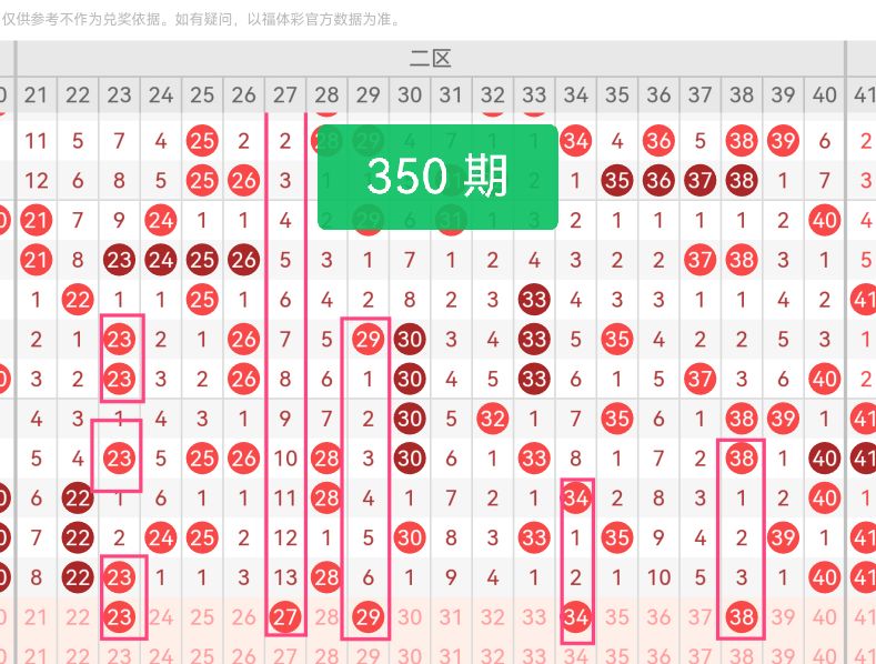 上期第二区间开奖4个号码,本期可能会稳定开出。23作为上期连号之一,热号惯性较强,在热区中易重复出现;27处于22-28的连号高发区间,能承接上期22、23、28的连号氛围,延续区间连号特征;29属于质数号码,近期该区质数出号占比稳定,且填补了28-34之间的空缺;34是中区热号,在近期出号中呈现“隔期活跃”态势,适配热区节奏;38作为该区末端号码,与40形成呼应,平衡区间首尾出号。