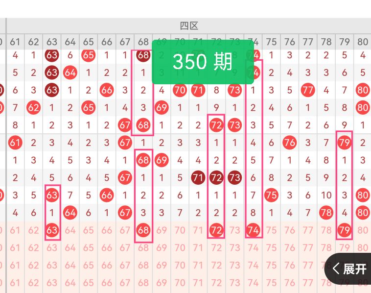 上期第四区间开奖4个号码,本期有望回补增加。63与上期64形成邻号关联,开启该区前端出号节奏;68属于中区热温号,在近期出号中呈现“逐步活跃”态势,适配升温节奏;71是质数号码,能丰富该区号码属性,且处于70-74的空白区间,起到补位作用;74处于该区中间位置,历史上常伴随78、80这类末端号码出现,形成区间衔接;79与80形成首尾呼应,契合区间升温趋势。