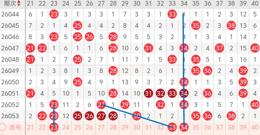 第二区间的走势分析:第二区间上期开出了十个号码球,主要的落号点位在二区间的前半区,走出了四奇六偶的形态走势,上期二区间的前半区落下了七个号码球,后半区落下了三个号码球,整个二区间处于走热的趋势,根据二区间的走势规律,今天的二区间我们主看前半区23的三重码,再看后半区33 34姊妹对号码的落位,走出了斜连以及隔期对称的走势,这三个号球建议大家打个三胆拖,或者打个三码复二比较稳妥,参考为主!