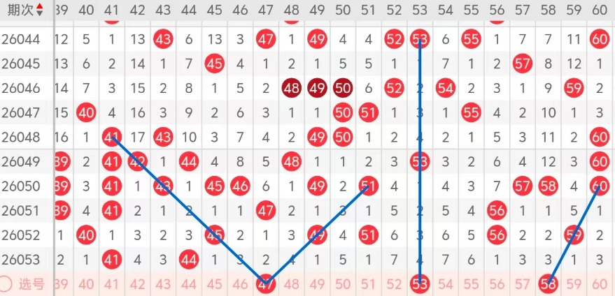 第三区间的走势分析:第三区间上期开出了两个号码球,主要的落号点位在三区间的前半区,走出了一奇一偶的形态走势,上期三区间的前半区落下了两个号码球,后半区没有号码球落下,整个三区间处于走冷的趋势,根据三区间的走势规律,今天的三区间我们主看前半区冷码的回补,主看47这个号码球的落位,再看后半区53 58的落位,走出了对称和斜连的走势形态!这三个号球建议大家打个三胆拖,或者打个三码复二比较稳妥,参考为主!