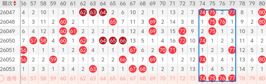 第四区间的走势分析:第四区间上期开出了三个号码球,主要的落号点位在四区间的前半区,走出了两奇一偶的形态走势,上期四区间的前半区落下了三个号码球,后半区没有号码球落下,整个四区间处于走冷的趋势,根据四区间的走势规律,今天的四区间我们主看后半区热码的回补,主看74 75 76 77这四个号码球的落位,落下2码的机会很大,注意它们两两组合的落位,这四个号球建议大家打个四码复三,或者打个四码复二比较稳妥,参考为主!