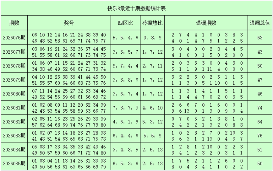 一、快乐8第2026086期奖号分析(定义:遗漏0-2期号码为热码,遗漏3-6期号码为温码,遗漏7期及7期以上号码为冷码,重码为上期开出奖号,邻码为上期没有出现,但与上期奖号差值为1的号码,例如上期开出奖号04,没有出现号码03和05,则本期03和05都为邻码,其它则为孤码。