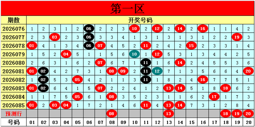 第一区【01-20】分析:上期该区走势一般开出了6个奖号:01、03、04、11、13、14,奖号冷温热比为1:1:4,包含5个孤码和1个邻码,没有出现重码。