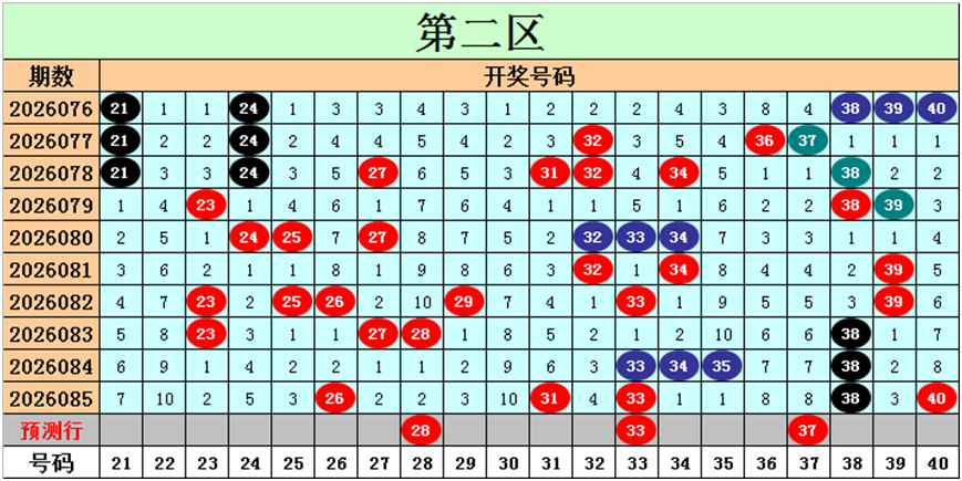 目前第二区包含10个热码:重码5个26、31、33、38、40,邻码2个27、34,孤码3个23、28、35;包含5个温码:邻码3个25、32、39,孤码2个24、29;包含5个冷码:邻码2个30、37,孤码3个21、22、36;号码冷温热个数比为5:5:10,重号、邻码、孤码个数比为5:7:8。