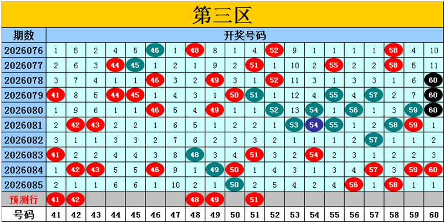 目前第三区包含14个热码:重码3个50、56、58,邻码6个41、49、51、57、59、60,孤码5个42、43、46、48、54;包含5个温码:邻码1个55,孤码4个44、45、52、53;包含1个冷码:邻码0个,孤码1个47;号码冷温热个数比为1:5:14,重号、邻码、孤码个数比为3:7:10。