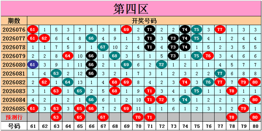 目前第四区包含13个热码:重码6个61、63、65、66、69、79,邻码3个68、78、80,孤码4个71、72、74、75;包含5个温码:邻码2个62、64,孤码3个73、76、77;包含2个冷码:邻码2个67、70,孤码0个;号码冷温热个数比为2:5:13,重号、邻码、孤码个数比为6:7:7。