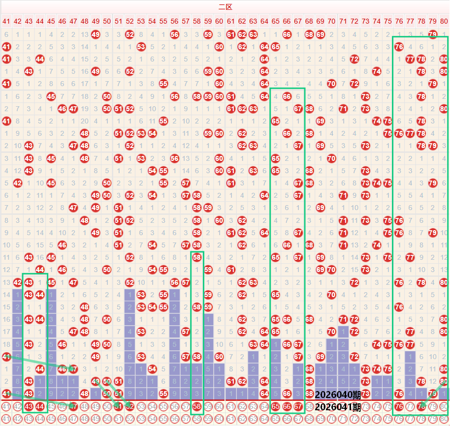 如图所示:在本期大数区的选号中注意在上期的走势中三区间开出了6枚中奖号码,落号数量出现了上升走势,落号形态保持的较为集中,在近30个开奖周期内,三区间的三连号下方开出重号的频率相对较低,但是在上期的走势中,49 50 51的下方开出了两枚重号走势,这在近30个开奖周期内,为首次出现,因此要考虑此小区段的连续热度走势,可关注50 51的重号三期走势,51 52以及49 50的前后二连走势,前段位置在上期开出了41 43的奇数二连走势,出现了重号走势,在近期的走势中43 44的二连走势较为强势,以及26 44的双码多次出现同步走势,在上期二区间开出了24的偶数第三期走势,本期注意26的偶数第四期走势,同时要注意26 44再次出现同步走势,在5字头上期开出55之后,本期建议考虑分双边的同路52 58,这里要注意52的位置衔接着上期的三区间热点位置,注意优先考虑52的走势,四区间上期开出了6枚中奖号码,开出了68 73的同步第三期走势,以及79的冷号,同时开出了73 76 79的同路三码走势,本期注意76 79的重号选择,以及近期的76 78 80有着较强的联动走势,在上期开出76之后,本期注意重点关注76的重号走势,以及76 78的偶数双码走势,在上期开出64 66 68的位置下方建议考虑65 66 67的三连号走势,或者是重点考虑奇数的边号走势。