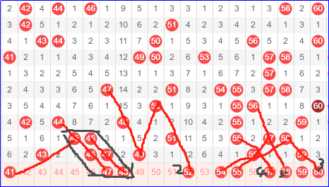 第三区间号码41-60,从上一期开奖我们可以看到三区前半段也是即将回到一个回暖的走势上,号码也在不断地增加,反倒是后半段逐渐趋于平稳,没什么特色了,所以这一期可以适度做这一区间。但是由于前半段起步,号码真的不好确定,只能针对性的挑选,而后半段虽说不是很热,奈何号码研究价值倒是比前半段更好分析。切记一点就是,针对性选号,并非所有走势都能如我们想象一样走出来。