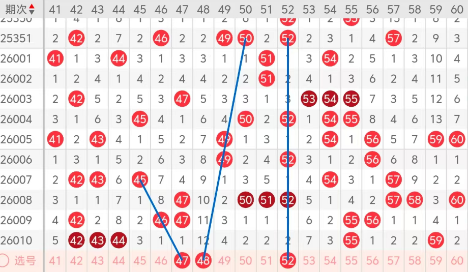 第三区间的走势分析:第三区间上期开出了五个号码球,主要的落号点位在三区间的前后半区,走出了三奇两偶的形态走势,上期三区间的前半区落下了三个号码球,后半区落下了两个号码球,整个三区间处于走温的趋势,根据三区间的走势规律,今天的三区间我们主看最近冷码回补走势的号码球,主看前半区47 48姊妹对号码的落位,落下一码的机会很大,再看后半区热码52的回补,这三个号球同落的机会很大,建议大家打个三胆拖,或者打个三码复二比较稳妥,参考为主!