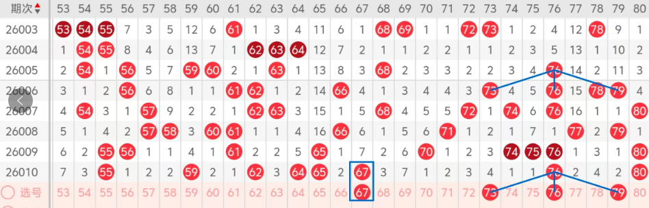 第四区间的走势分析:第四区间上期开出了六个号码球,主要的落号点位在四区间的前后半区,走出了两奇四偶的形态走势,上期四区间的前半区落下了四个号码球,后半区落下了两个号码球,整个四区间处于走热的趋势,根据四区间的走势规律,今天的四区间我们主看前半区重码的落位,67这个号码球走出重码的落位,再看后半区热码组合73 76 79的落位,落下1-2码的机会很大,这四个号球建议大家打个四码复三,或者打个四码复二比较稳妥,参考为主!