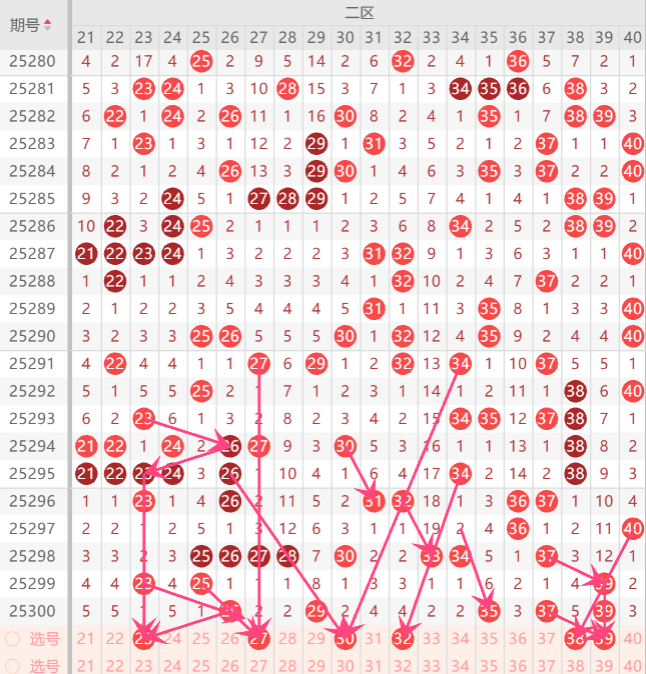 二区间注意参考的号是22.23.24.25.26.27.32.34.35.38.39中关注3-4码开出机会。