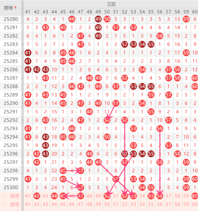 而三区的打底号是42.43.45.47.48.50.51.52.53.55.56.60中参考3-4码开出机会,