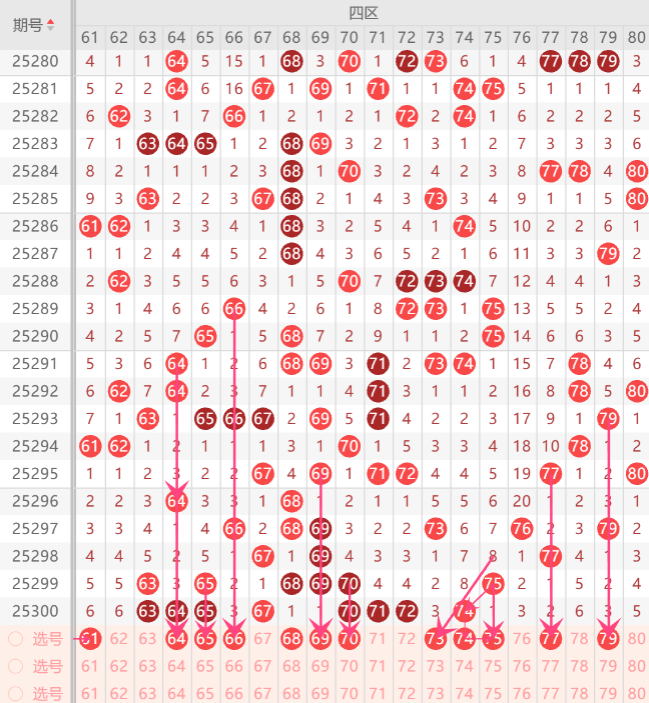 四区在近期的走势上来判断机会的话,整体区间是温热形态,上期四区间区开出了8码,而且上期区间开出的形态是重码三连号和假五连走势,上期小妹在文章中布局到了4码开出,那么本期四区间重点关注的形态是重码分边,隔期回补,对称形态,那么本期首先注意重码分边上注意62.66.号中开出一码机会,而隔期回补上注意68.69.75中参考一码回补机会,至于对称形态上的64.66.68.69.77.78.79中开出1-2码机会,如图所示。