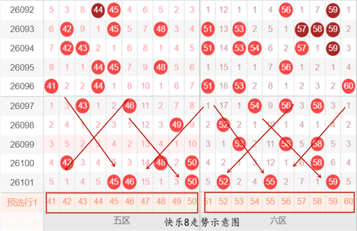 第六区间,上期开出三码,目前此区间处于热区,根据走势分析预计本期此区间将分散开号,预计将继续出现走热趋势。