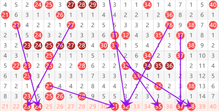 斜连号:与上期开奖号码相邻形成一条斜线的号码。比如上上期开出01,上期开出02,本期开出03,叫做三期斜连号。