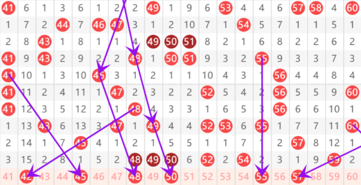 上期三区号码开出48 49 50 52 54 59 六个号码,三区间整体热度上升,本期三区间热度下滑,预计开出号码五个左右,三区间本期重点号码推荐,重号重点推荐48 50,邻号重点推荐关注55 ,孤号重点推荐关注42 45 57