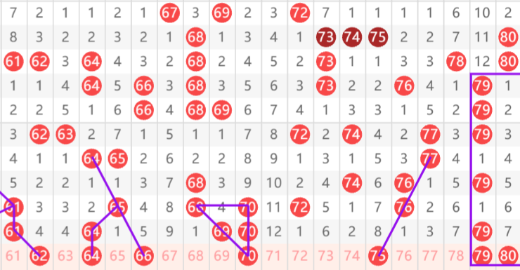 上期四区间开出61 64 69 70 79 五个号码,四区间整体热度下滑,本期四区间热度持平,预计开出号码五个,本期四区间重点号码推荐,重号重点推荐64 70 79,邻号重点关注62 80,孤号重点推荐66 75;