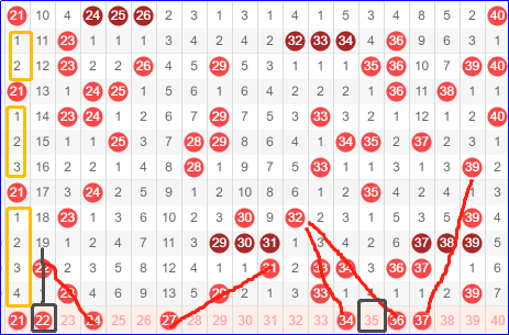 第二区间号码21-40,第二区间真的是疯疯癫癫,一会热一会冷,这个节奏不好把握。唯一看好的35没有出现,22是必杀号码,按照我们常讲的冷号原则,这一期你知道怎么做了。这一期需要注意一下重号和上一期的空白区域了。具体可参考链接文章。
