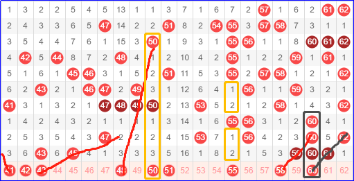 第三区间号码41-60,三区与四区昨天无缝衔接了,走出三连号,这一期尤其注意这个三连号周边号码的延伸和重号。50-55这一块N多期没有出现像样的号码了,如果想做的话可以适当关注一下。具体见链接文章。