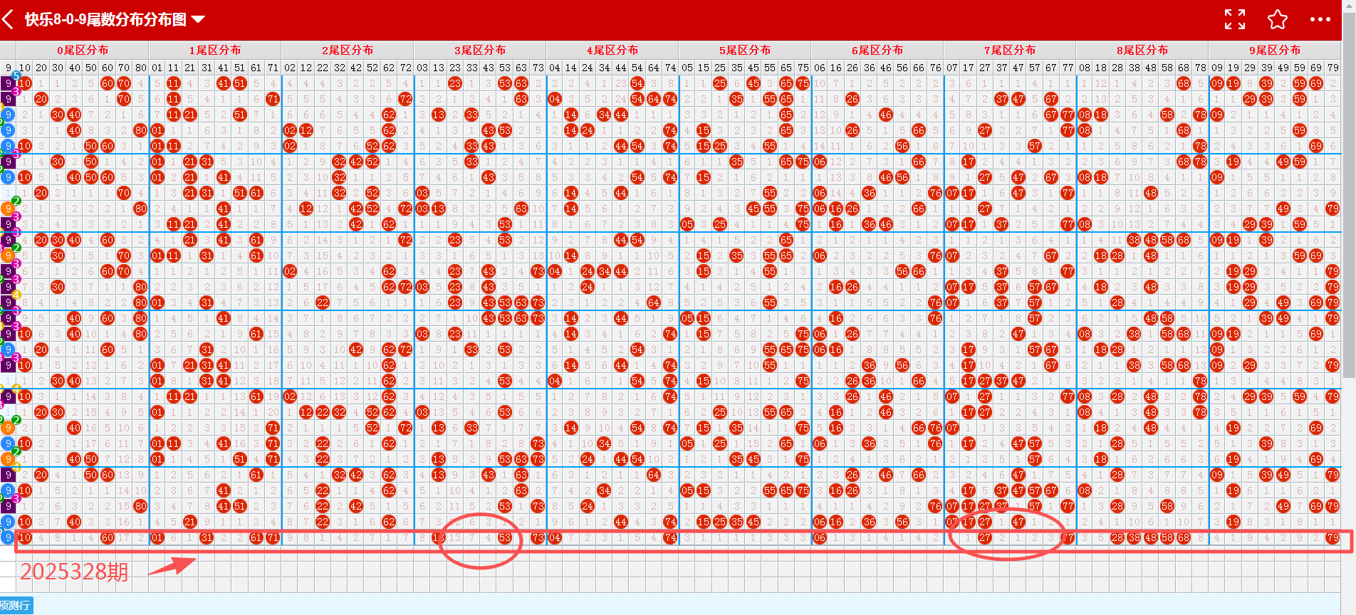 上图是快乐八2025328期的尾码走势图,从图中看0尾到9尾出号个数依次是:0尾号码区开出2个;1尾号码区开出4个;2尾号码区开出0个;3尾号码区开出3个;4尾号码区开出2个;5尾号码区开出0个;6尾号码区开出1个;7尾号码区开出2个;8尾号码区开出5个;9尾号码区开出1个;再看小尾号码(0尾-4尾)区有11码,大尾号码(5尾-9尾)有9码;数据比对统计后可以看到本期8尾出号数量最多,一共开出了5个中奖号码。本期2、5尾出现断区!由走势比对推断2025329期重点需要关注3、7尾区号码下号热度回补和落号数量增加的概率较大。