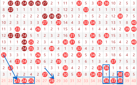 连号空一带号23 24 26已经遗漏2期没有出号了,本期我们要注意一下落下两个号码的情况,本期这里我们要重点注意一下,可以在这里定一胆码。本期的28 29也是有机会出一个号码的,我们重点关注一下28号数字的出号情况就可以了。连号空一带号32 34 35本期我们先放一期,等到下期在来做号吧。本期的36 37 38我们要注意出号了,重点关注一下36 38号数字的出号情况就可以了。