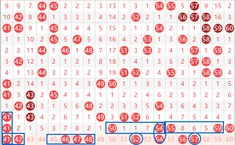 本期的41号数字我们要注意走三重的情况,从012路走势图上来说,35 41是有一个要走三重的,我们重点关注一下41号数字就可以了。本期的42 43 44号数字我们也是要注意出一个号码的情况,我们重点关注一下42号数字的出号情况就可以了。本期的45 46 47 48应该也是要落号的,我们重点关注一下47 48的出号情况就可以了。本期的52 57 62都是空三中心号,本期我们要注意一下出一个号码的,重点关注一下52 57的出号情况。