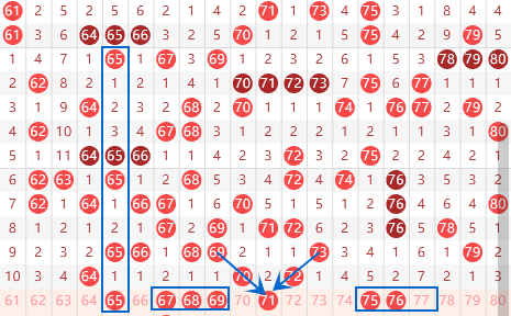 上期的连号65 66和连号68 69没能够出重号,那么本期就会回补号码了,这里我们要重点关注一下,重点关注65 68 69的出号情况,这里应该会出1-2个号码来的,可以在这里定一胆码的。本期的71号数字我们也是要注意的,本期也是属于复制号码,本期我们要注意一下它的出号情况。本期的75 76 77号数字我们要也是要注意的,上期就应该出号的了,但是没有出,本期我们就要注意出连号的可能了。