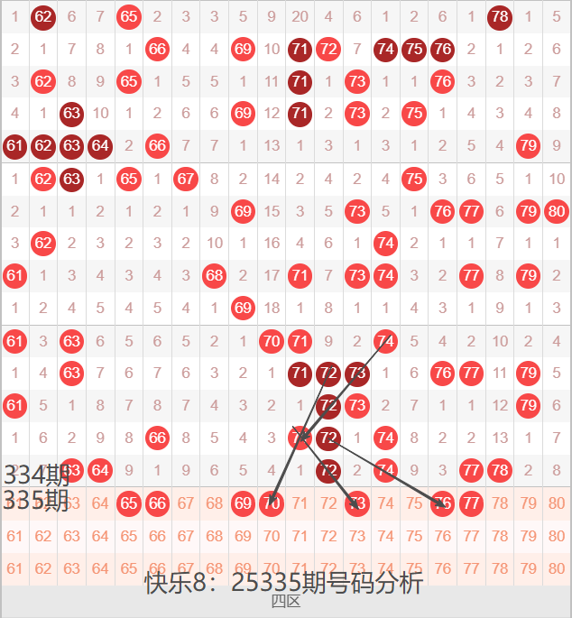 回顾25334期开奖号码:02 03 08 16 18 24 30 32 33 35 36 42 49 54 63 64 72 74 77 78 ,最近一段时间号码爆区几率特别高,目前已经连续多次出现爆区热开的情况,爆区之后基本上都是迅速回调,转换至其他区间继续暴热,大家若是能抓准区间,或许有很大的机会,但是号码的变盘规律是非常的快,很难把握,个人建议谨慎选择,不要 盲目的去操作~~