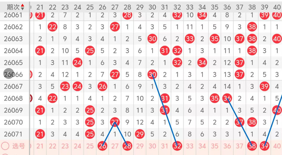 第二区间的走势分析:第二区间上期开出了三个号码球,主要的落号点位在二区间的前半区,走出了三奇的形态走势,上期二区间的前半区落下了三个号码球,后半区没有号码球落下,整个二区间处于走冷的趋势,根据二区间的走势规律,今天的二区间我们主看前半区26 28的组合,也是形态夹码的回补,再看32的斜连码走势,注意28 32的组合,最后关注38 39姊妹对的落位,落下一码的机会很大,这五个号码球建议大家打个五码读四,或者打个五码复三比较稳妥,参考为主!