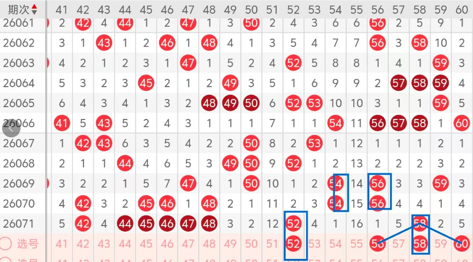 第三区间的走势分析:第三区间上期开出了八个号码球,主要的落号点位在三区间的前半区,走出了两奇六偶的形态走势,上期三区间的前半区落下了六个号码球,后半区落下了两个号码球,整个三区间处于走热的趋势,根据三区间的走势规律,今天的三区间我们主看后半区重码的落位,52 58的重码,再看56 60这两个号码的回补,也是热码组合52 56 58 60的组合,这四个号球建议大家打个四胆拖,或者打个四码复三比较稳妥,参考为主!