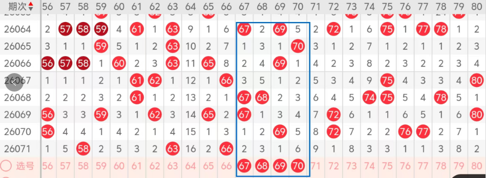 第四区间的走势分析:第四区间上期开出了两个号码球,主要的落号点位在四区间的前半区,走出了一奇一偶的形态走势,上期四区间的前半区落下了两个号码球,后半区没有号码球落下,整个四区间处于走冷的趋势,根据四区间的走势规律,今天的四区间我们主看中间为67 68 69 70这几个冷码的回补,落下2码的机会很大,注意67 68 69组合以及68 69 70的组合,这四个号球建议大家打个四码复三,或者打个四码复二比较稳妥,参考为主!