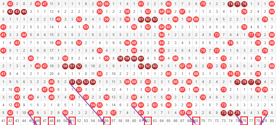 接下来我们一起看走势图,我们把01-40分为前区,41-80分为后区。